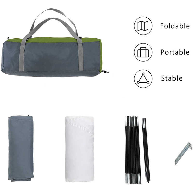 Material:190T polyester flysheet provides sun protection, resists wind and sand, 210D Oxford cloth at the bottom which will push it quick-drying, windproof and water resistant of 1000-1500,prevents water penetration to keep inside dry. Using 8.5MM Aluminum pole as the support rod, light and firm, with 8 iron ground nails to increase its stability and prevent the bracket from moving.