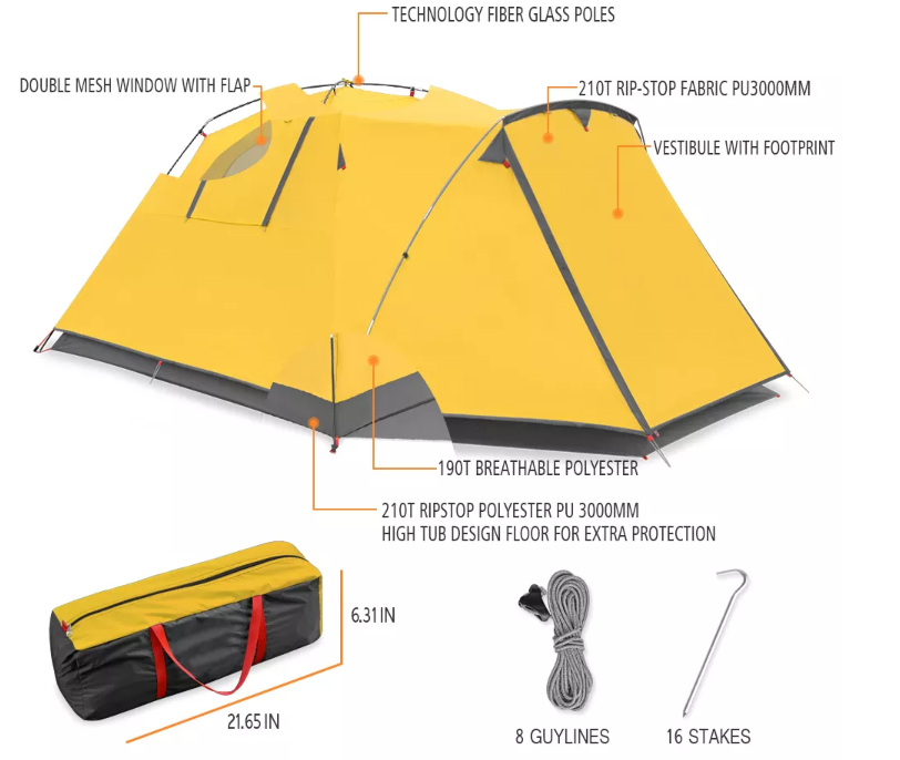 -Quick and easy to set up -Waterproof :3000 mm -Comes with a portable carry bag for easy transit -2 Mesh windows and 2 doors for added Ventilation - Double Zipper Door - Suitable for four adults